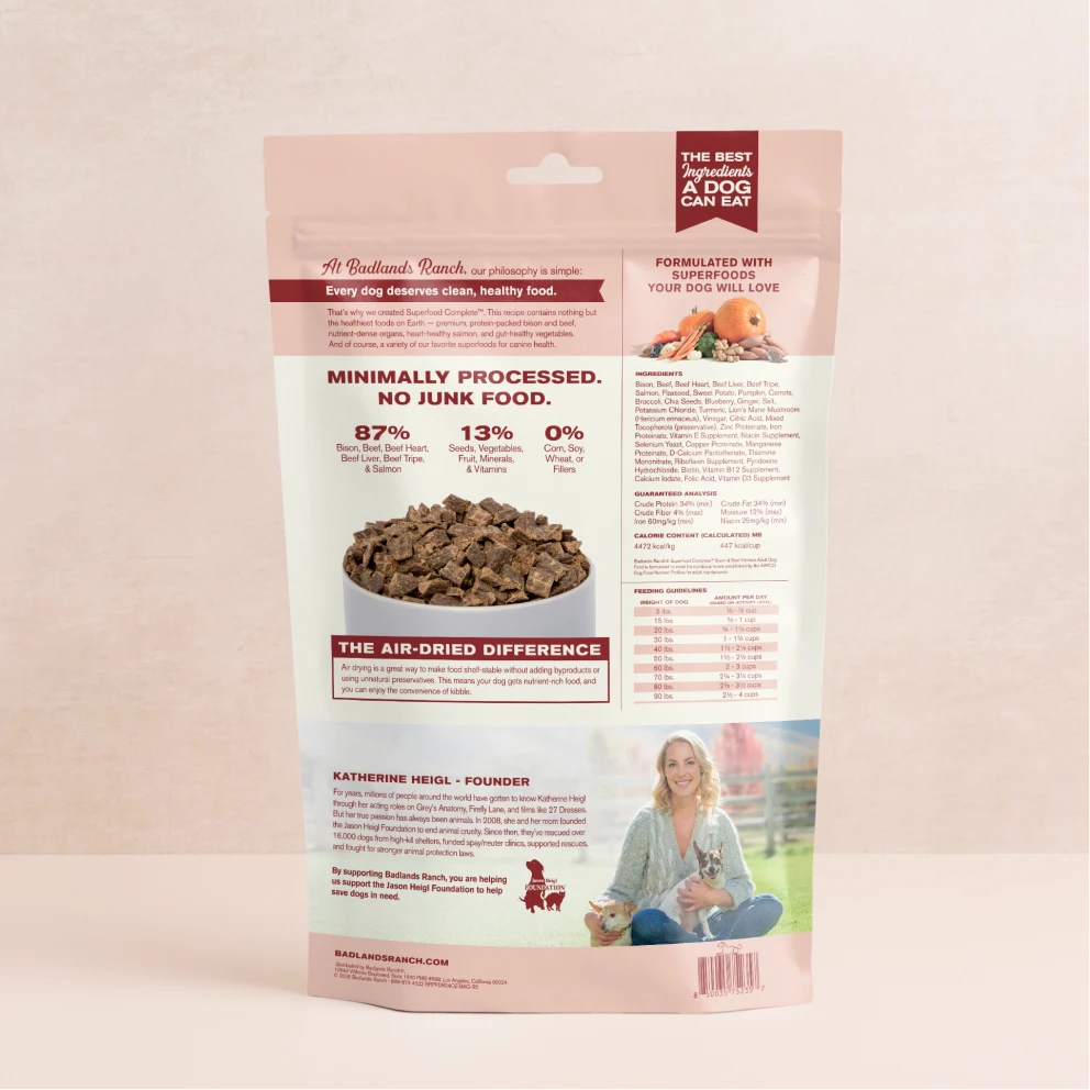 Superfood Complete is a carefully-crafted dog food formulated with premium bison and beef, nourishing salmon, gut-healthy vegetables, and Katherine’s favorite superfoods. These ingredients are hand-selected to deliver all of the nutrients your dog needs to enjoy smooth digestion and vitality. The nutritious ingredients in Superfood Complete are prepared using our “low and slow” cooking method to help avoid the harmful by-products that can result from high-heat cooking. Then, Superfood Complete is preserved with our air-drying process, so it has the convenience of kibble and the nutrition of whole foods.*